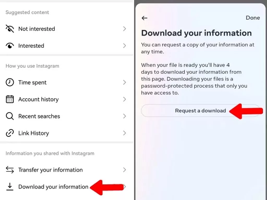 مِتا (فیسبوک اسبق) راهکاری رسمی برای دیدن مطلب های حذف شده اینستاگرام پیشروی کاربران این شبکه اجتماعی قرار نداده است؛ اما ترفندهایی برای دستیابی به این مقصد وجود دارند. برای مثال میتوان خواست دانلود دادههای اینستاگرام را به ثبت رساند که طبق معمولً برخی از مطلبهای قبل درون آن وجود دارد. این چنین روشهای فرد دیگر همانند پشتیبانیگرفتن از نوتیفیکیشن هیستوری نیز وجود دارد که در قسمتهای بعدی به آنها خواهیم پرداخت.