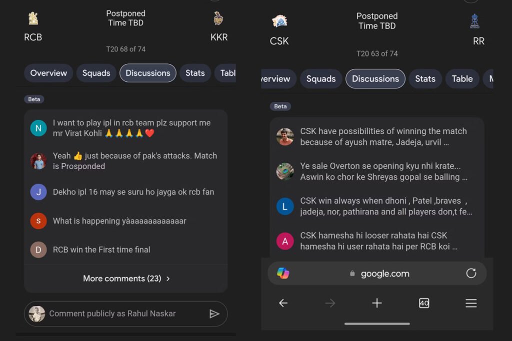 گوگل قابلیتی تازه به نام Discussion را برای اپلیکیشن جستجو موبایلی خود آزمایش میکند. این ویژگی زمان جستجوی مسابقات ورزشی همانند تیم A در برابر تیم B در نتایج نمایش داده میشود و فعلاً فقط در ایالات متحده مشاهده میشود.